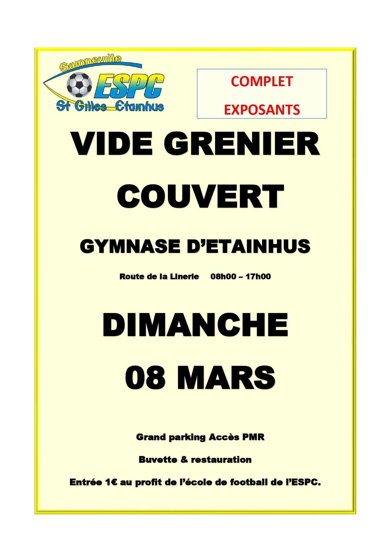Du 08 Mars Vide grenier de l'ESPC Timetable : 08h00 - 17h00 Adresse : Etainhus Pole sportif Michel BOULAY Ajouter au calendrier Sur la cartoEtainhus Pole sportif Michel BOULAY Fermer Precedent Retour à la liste Suivant
